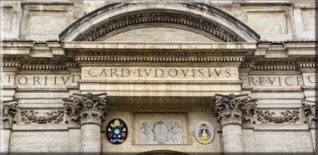 Sulla parete di controfacciata il gruppo scultoreo "La Magnificenza e la Religione" di Alessandro Algardi sostiene l'iscrizione commemorativa della consacrazione della chiesa.